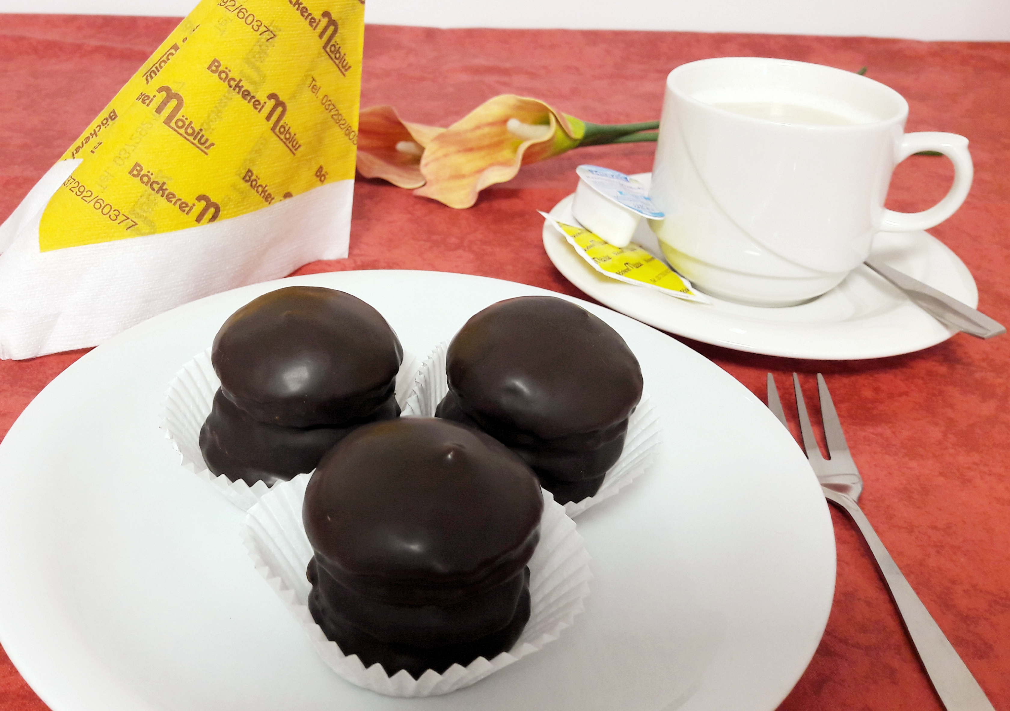 Biskuitschalen mit Pudding gefüllt und mit kakaohaltiger Fettglasur überzogen