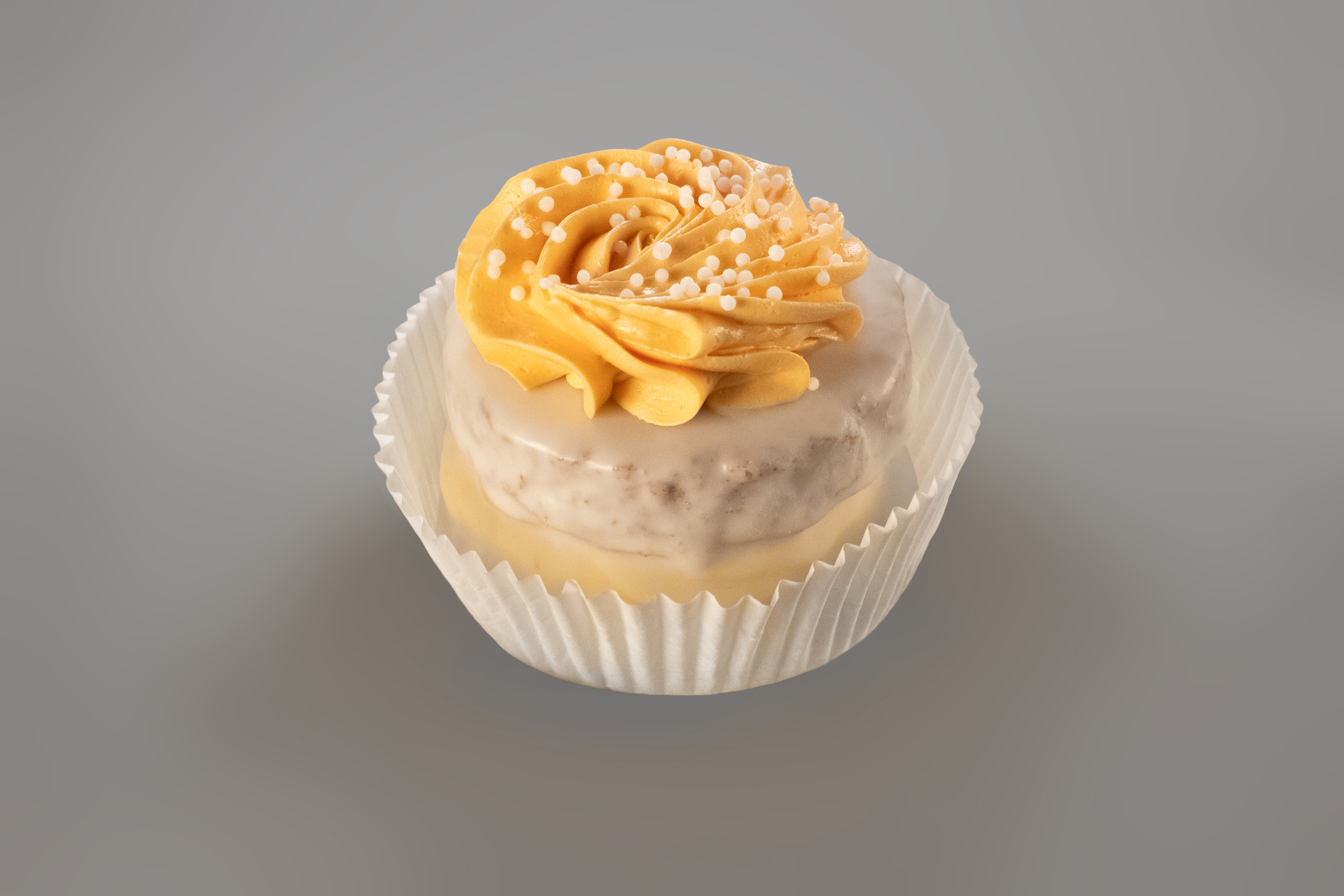 Schoko-Biskuitschichten mit Orangen-Butterkrem und Orangenfruchtfüllung zusammen gesetzt, und mit weißer Fettglasur überzogen. Die Blüte aus Butterkrem garnieren wir von Hand auf.
