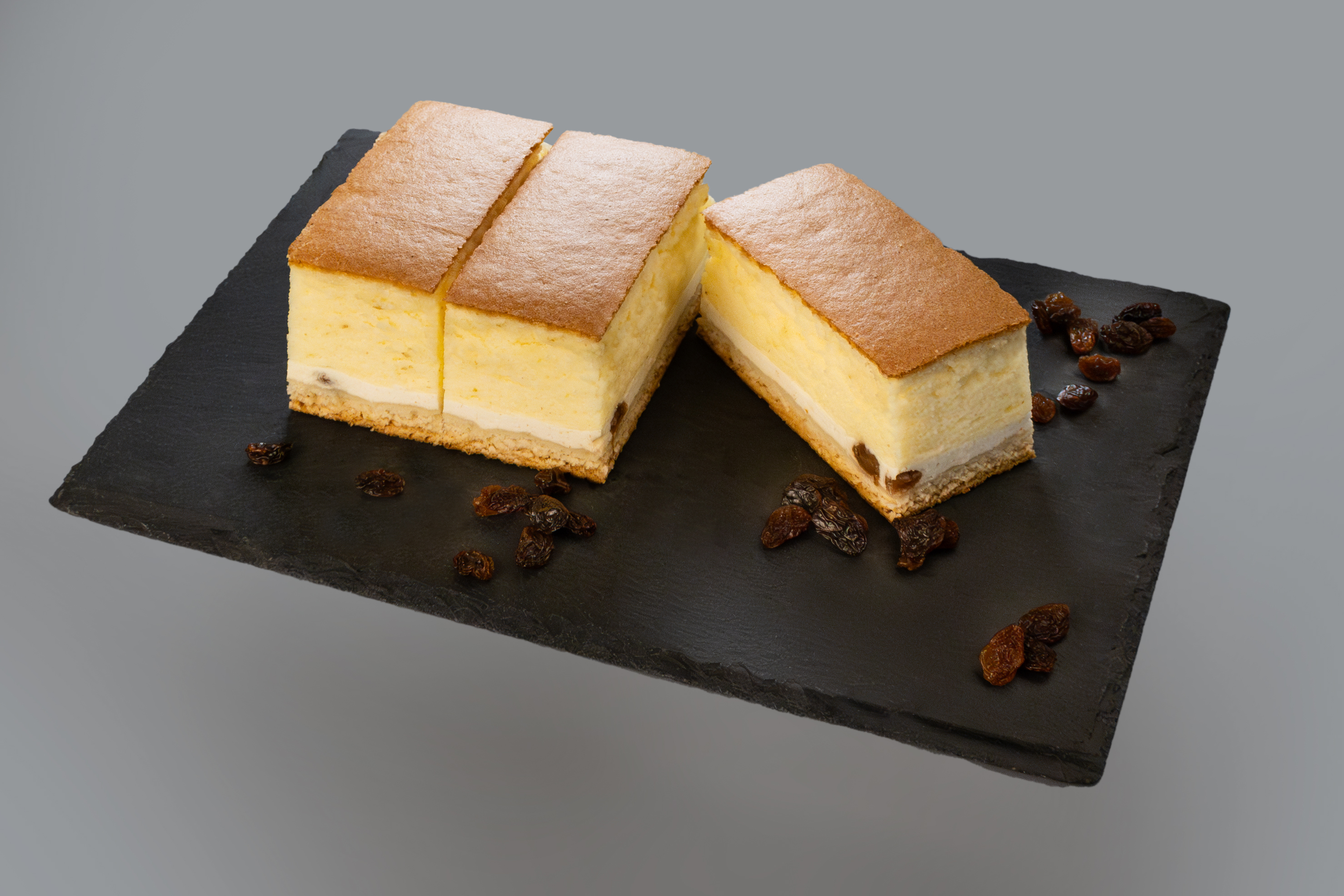 Leichter Hefefeinteig mit einer Schicht Quarkmasse und Sultaninen, darauf die lockere Eierscheckenmasse, welche bei uns nach traditionellem Rezept hergestellt wird - überzeugen Sie sich selbst davon!