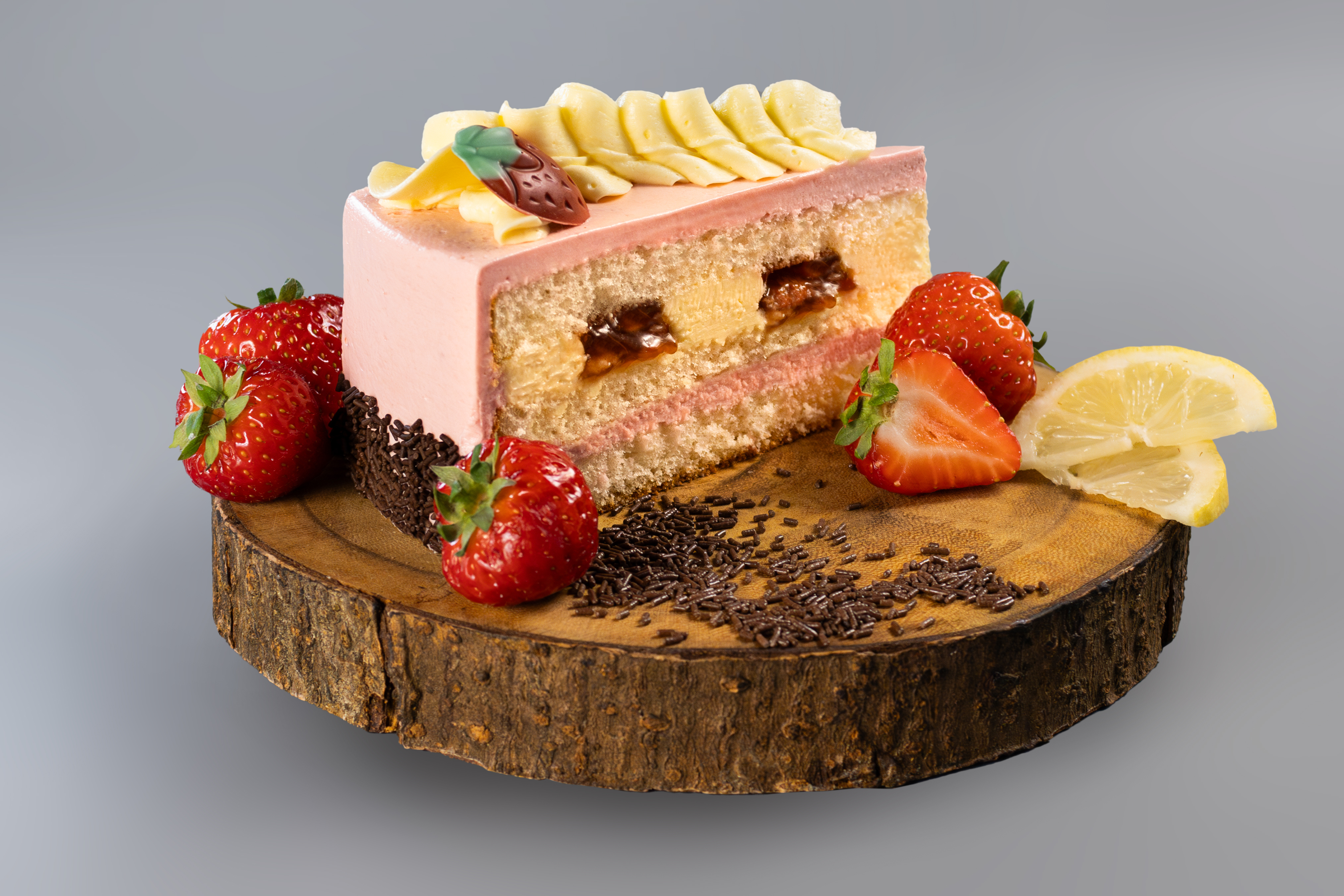 Butterkremtorte bestehend aus 3 Lagen Biskuit, gefüllt mit einer Schicht Erdbeerkrem und einer Schicht mit Zitronenkrem und Erdbeerfruchtfüllung. Eingestrichen ist die Torte wieder mit Erdbeerkrem. Das Dekor besteht aus Zitronenkrem und Schokodekor.