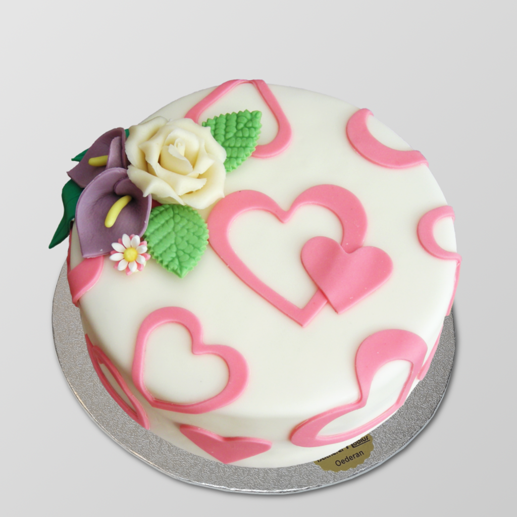 Die Torte ist über und über mit rosa Herzen verziert.