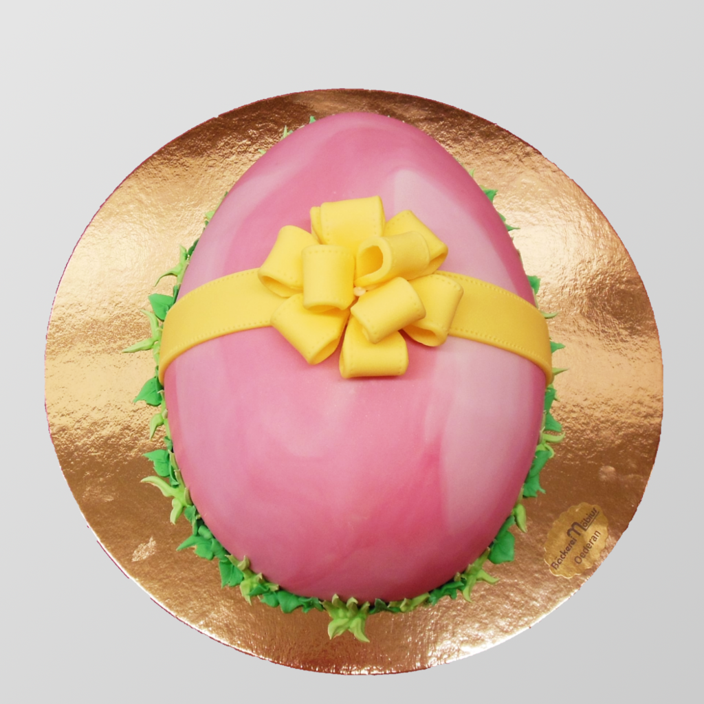 eiförmige, extra hohe Torte, Ø28cm mit Kremfüllung & mit gefärbter Dekormasse eingedeckt